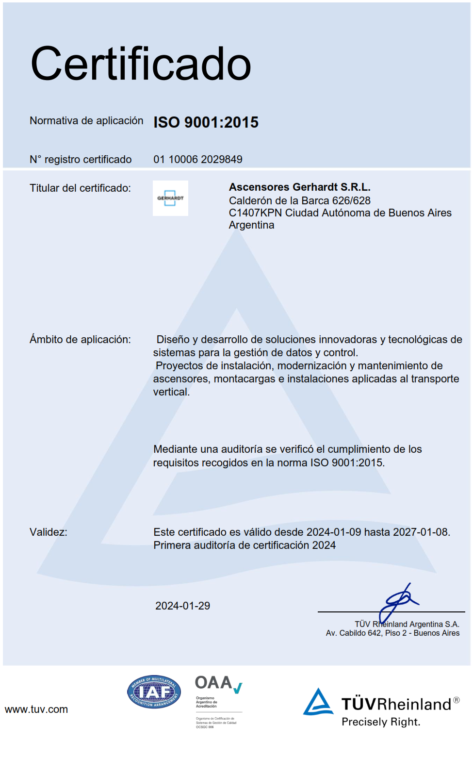 Ascensores Gerhardt SRL tiene certificación de Calidad en ISO 9001 2015 que pertenece a los estándares ISO (International Organization for Standardization).